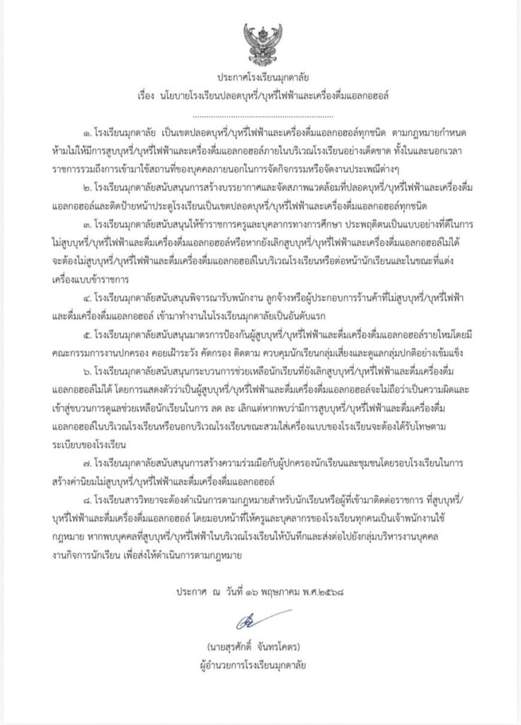 โรงเรียนมุกดาลัย ขอประกาศให้ทราบว่า โรงเรียนเป็น เขตปลอดบุหรี่ บุหรี่ไฟฟ้า และเครื่องดื่มแอลกอฮอล์ทุกชนิด ตามนโยบายและกฎหมายที่กำหนด #ห้ามสูบหรือใช้บุหรี่/#บุหรี่ไฟฟ้า#และห้ามนำหรือดื่มเครื่องดื่มแอลกอฮอล์ภายในบริเวณโรงเรียนอย่างเด็ดขาด ทั้งในและนอกเวลาราชการ โรงเรียนขอความร่วมมือจากนักเรียน ผู้ปกครอง บุคลากร และผู้มาติดต่อทุกท่าน ร่วมกันสร้างสภาพแวดล้อมที่ปลอดภัยและเหมาะสม เพื่อสุขภาวะที่ดีของนักเรียนทุกคน