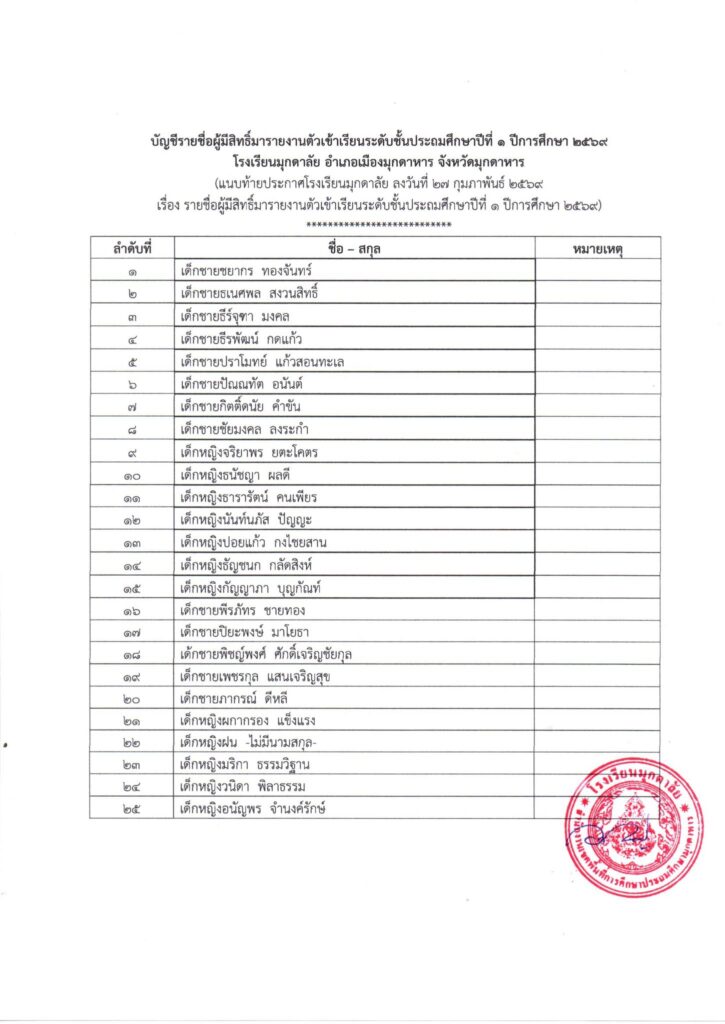 ประกาศโรงเรียน ประกาศโรงเรียนมุกดาลัย เรื่อง รายชื่อผู้มีสิทธิ์มารายงานตัวเข้าเรียนระดับชั้นประถมศึกษาปีที่ 1 ปีการศึกษา 2569 mukdalai_admin Posted on 7 วัน ago Continue Reading Previous: ประกาศโรงเรียนมุกดาลัย เรื่อง การเก็บเงินบำรุงการศึกษา ปีการศึกษา 2569Next: กิจกรรมวันมาฆบูชา ใส่ความเห็น ยกเลิกการตอบอีเมลของคุณจะไม่แสดงให้คนอื่นเห็น ช่องข้อมูลจำเป็นถูกทำเครื่องหมาย *ความเห็น * ชื่อ * อีเมล * เว็บไซต์ บันทึกชื่อ, อีเมล และชื่อเว็บไซต์ของฉันบนเบราว์เซอร์นี้ สำหรับการแสดงความเห็นครั้งถัดไป Related News ประกาศโรงเรียน ประกาศโรงเรียนมุกดาลัย เรื่อง การเก็บเงินบำรุงการศึกษา ปีการศึกษา 2569 mukdalai_admin Posted on 7 วัน ago ประกาศโรงเรียน ประกาศนโยบายโรงเรียนปลอดบุหรี่ mukdalai_admin Posted on 2 สัปดาห์ ago ประกาศโรงเรียน ประกาศรายชื่อผู้มีสิทธิ์รายงานตัวเข้าเรียนอนุบาล 2 mukdalai_admin Posted on 3 สัปดาห์ ago